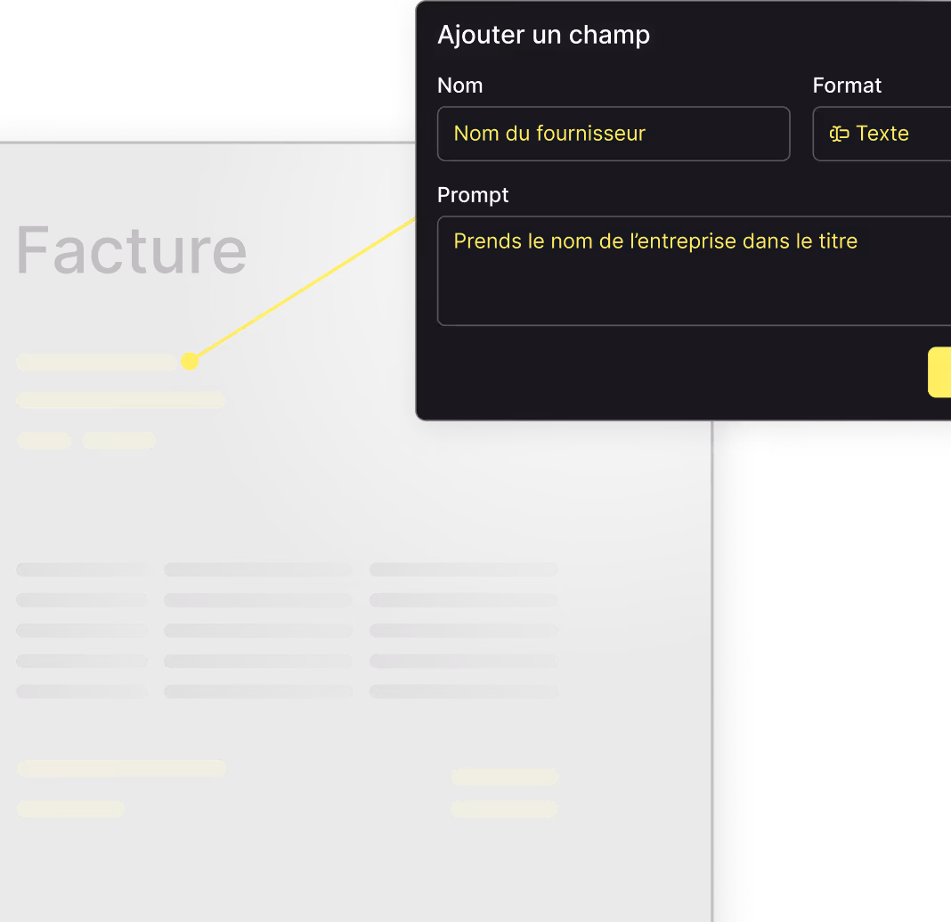 Yes, Koncile offers advanced customization for data extraction, allowing you to tailor it precisely to your needs. Through an intuitive interface, you can easily define the information to be extracted without requiring technical skills. It’s possible to create custom fields, such as "Contract Number," "Customer Reference," or "Due Date," and assign each one a specific data type (text, number, date, amount, email address, etc.). This helps optimize extraction and ensure data validity. Additionally, you can guide the algorithm with extraction rules, such as specifying that the VAT number is always near a certain keyword.