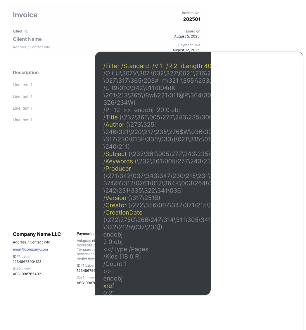 Fake payslips are among the most commonly falsified documents, particularly in credit or tenancy applications. Koncile applies two levels of control: metadata analysis, where alterations typically leave clear forensic traces, and amount coherence checks, gross pay, net pay, social contributions, built on a deep knowledge of payroll regulations, designed with domain experts to be immediately operational.