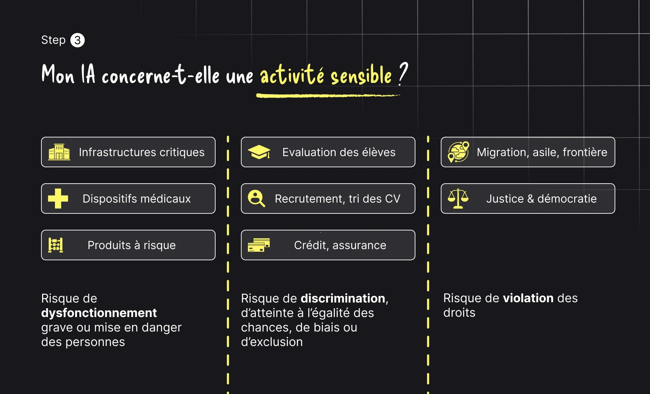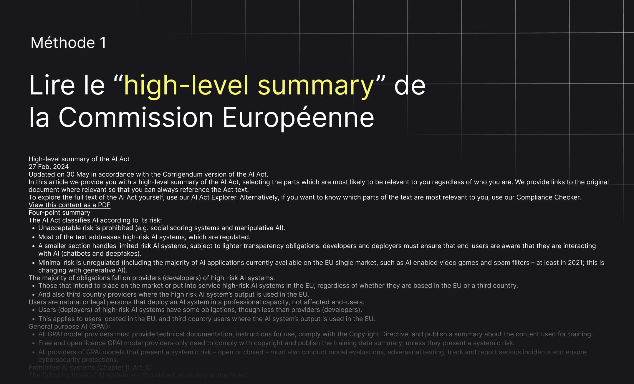 Même les versions “simplifiées” publiées par la Commission européenne restent difficiles à exploiter pour des équipes produit, tech ou métier. C’est précisément pour cette raison qu’il est plus efficace de raisonner par questions successives, en suivant la grille de lecture du risque.