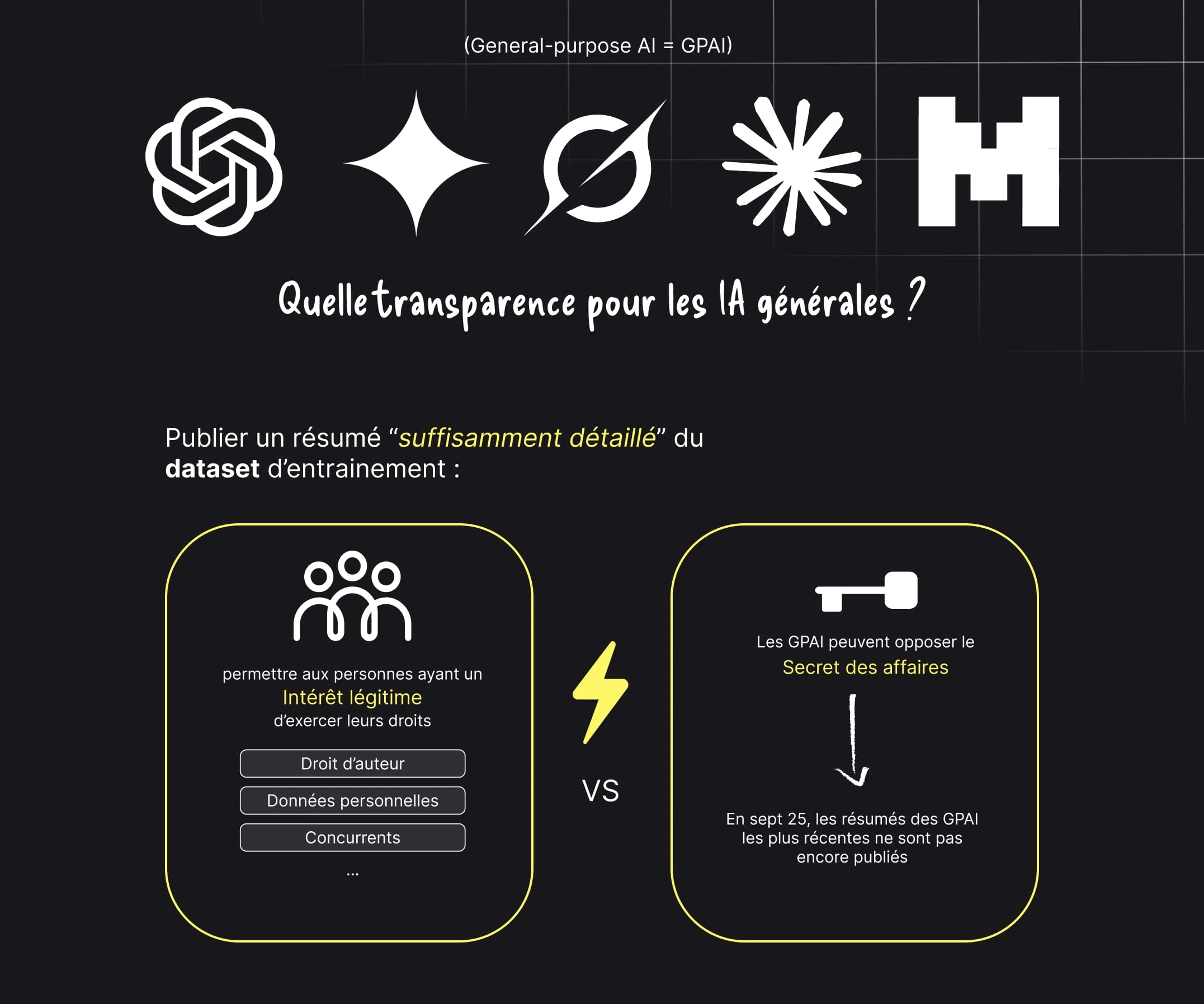 Le AI Act introduit également un cadre inédit pour les General Purpose AI (GPAI), comme les grands modèles de langage. Ces modèles devront publier un résumé suffisamment détaillé de leurs données d’entraînement, respecter le droit d’auteur, réaliser des tests de sécurité et déclarer les modèles présentant un risque systémique.